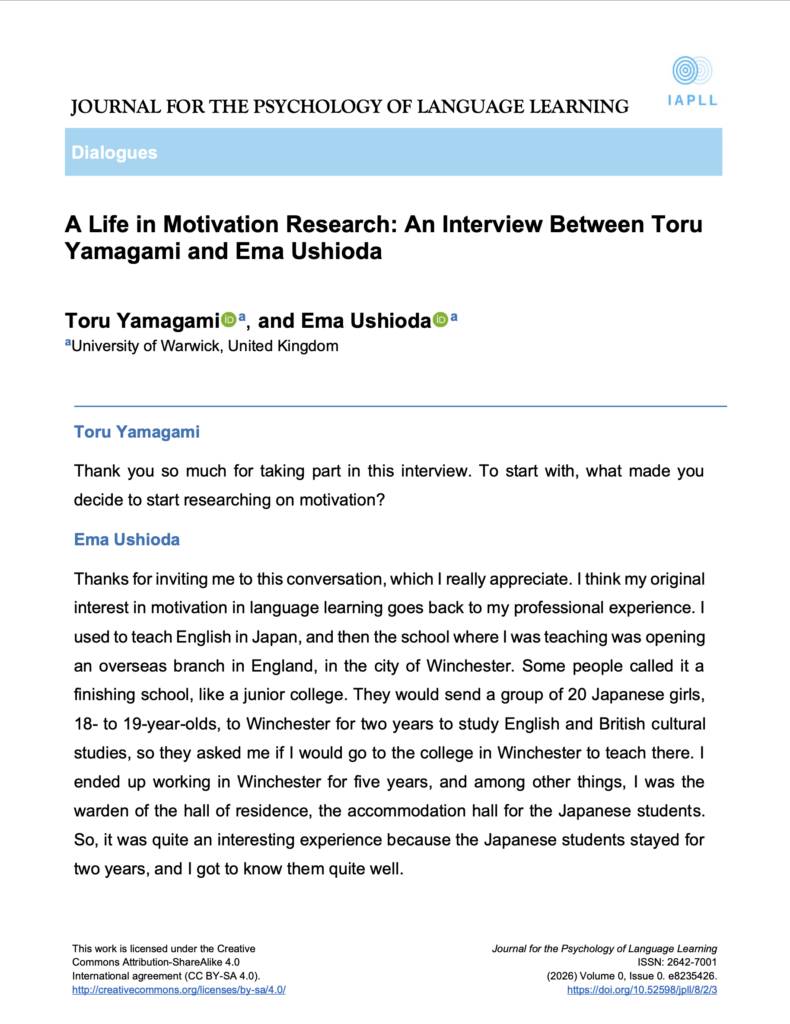 - 📘 Interview Article Published in The Journal for the Psychology of Language LearningI am pleased to share that I have had the valuable opportunity to publish the following interview article in The… Read more: 📘 Interview Article Published in The Journal for the Psychology of Language Learning